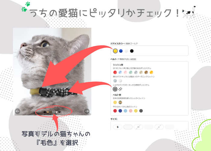 公式サイトでデバイスとベルトを選んで、あなたの猫ちゃんと似た毛色を選ぶと、こんな感じってイメージ通りかチェックもできちゃう