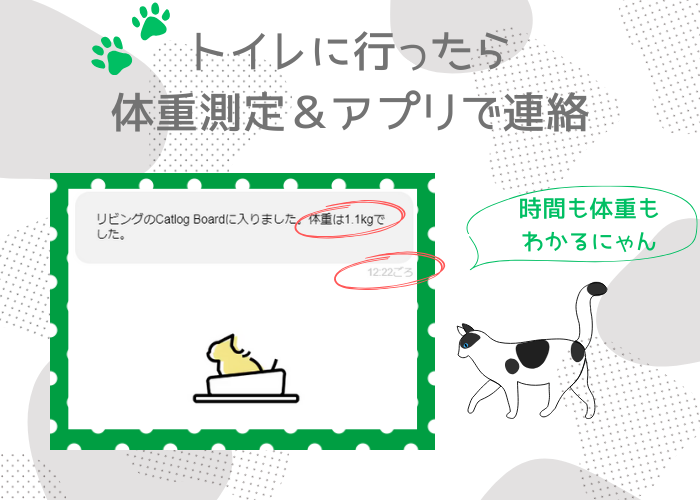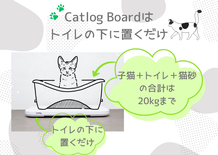 体重の測定も記録もグラフ化もおまかせ、何匹飼っていても1台で大丈夫、心配ごとの相談もできて、危険のない完全コードレスのCatlog Boardをトイレの下に置くだけ。