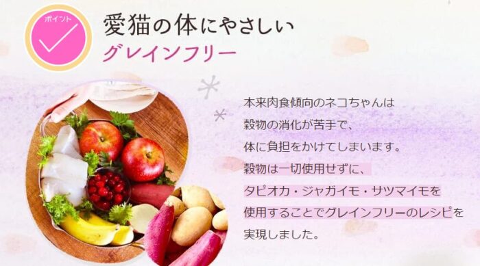 穀物が入っていないことで、必要以上の不溶性繊維の摂取がないのでお腹にやさしい。