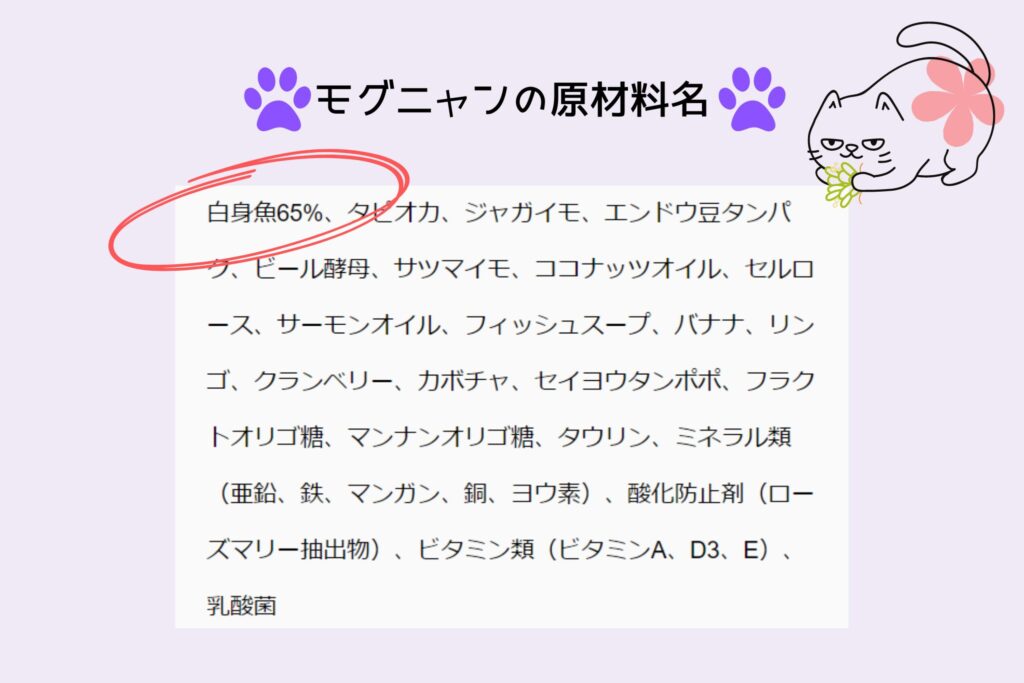 やっぱり、モグニャンは白身魚を使ったキャットフードだから高タンパクで低脂質ってコト!